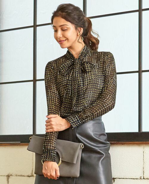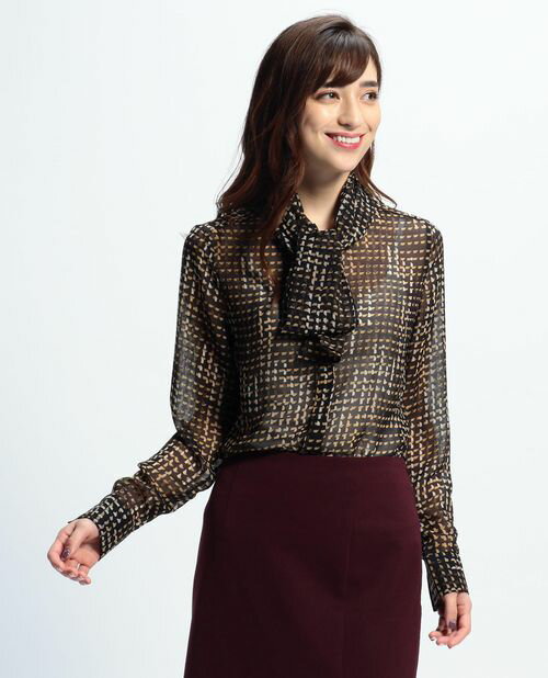 ジオメトリックプリントシフォンボウタイ長袖ブラウスジオメトリック調のチェック柄が印象的な長袖ブラウス。